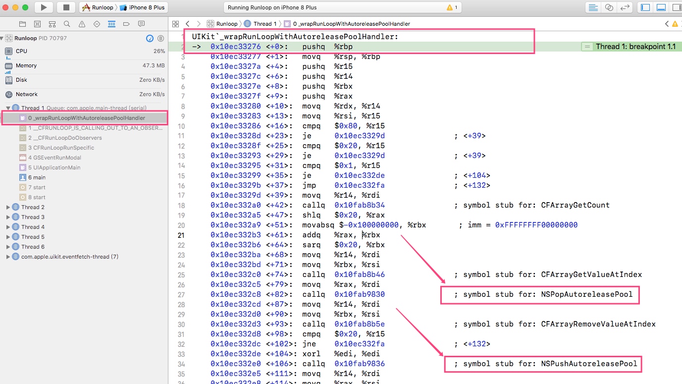 _wrapRunLoopWithAutoreleasePoolHandler 这个方法的实现其实我们并不清楚,网上没有找到对应的实现,不过我们可以打下符号断点来看看有没有线索。果然应用刚启动就执行了这些方法。看左侧的调用栈确实是从 Observer 的回调执行过来的。下面两个是我们熟悉的 Pop 和 Push 操作,基本上可以确认,Autorelease 机制是在进入 Runloop 的时候就创建了一个新的 AutoreleasePoolPage。退出或者休眠的的时候回收 AutoreleasePoolPage。